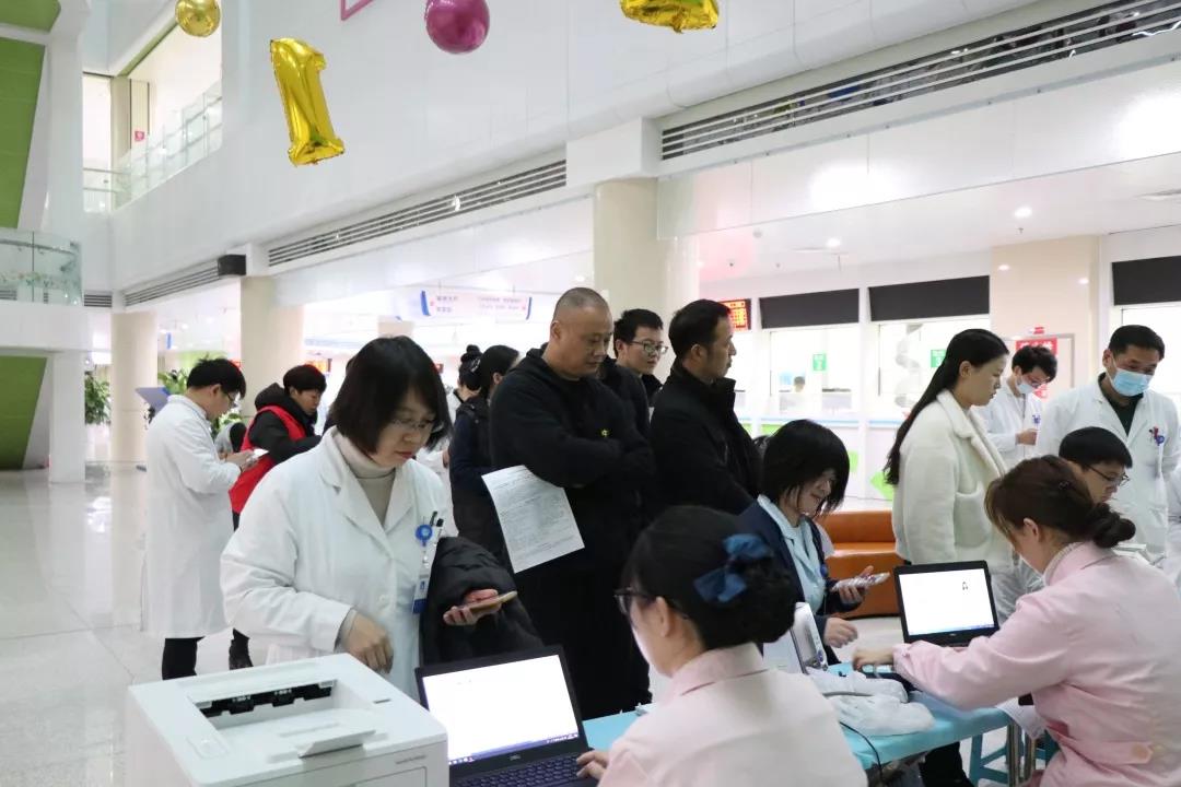 早上8:30,身着工作服的医务人员在门诊大厅排起了长长的队伍,为无偿献血活动拉开了序幕。