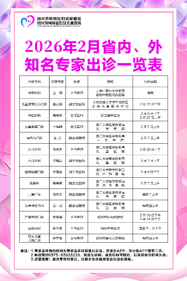 专家出诊信息(2026年2月)